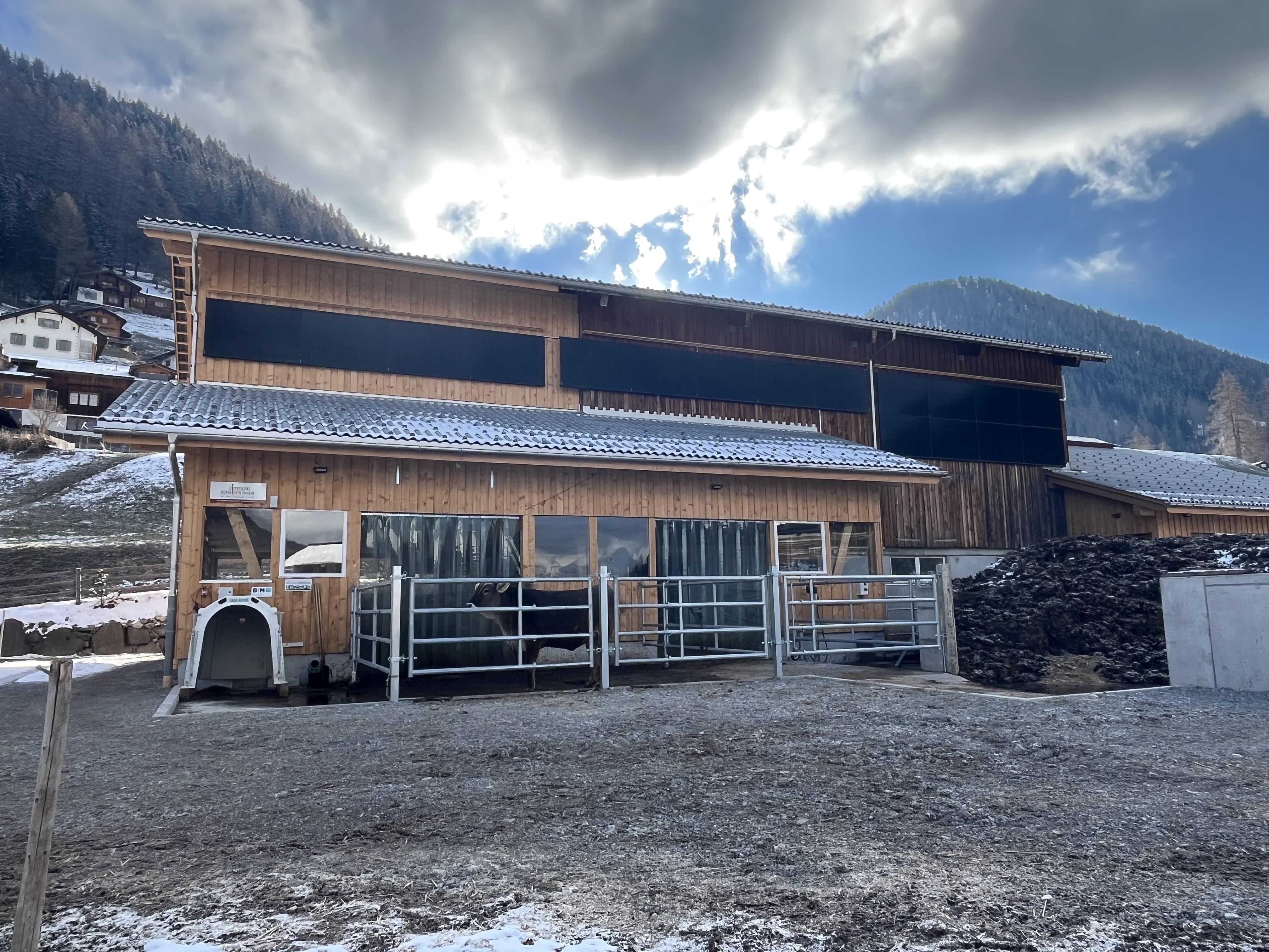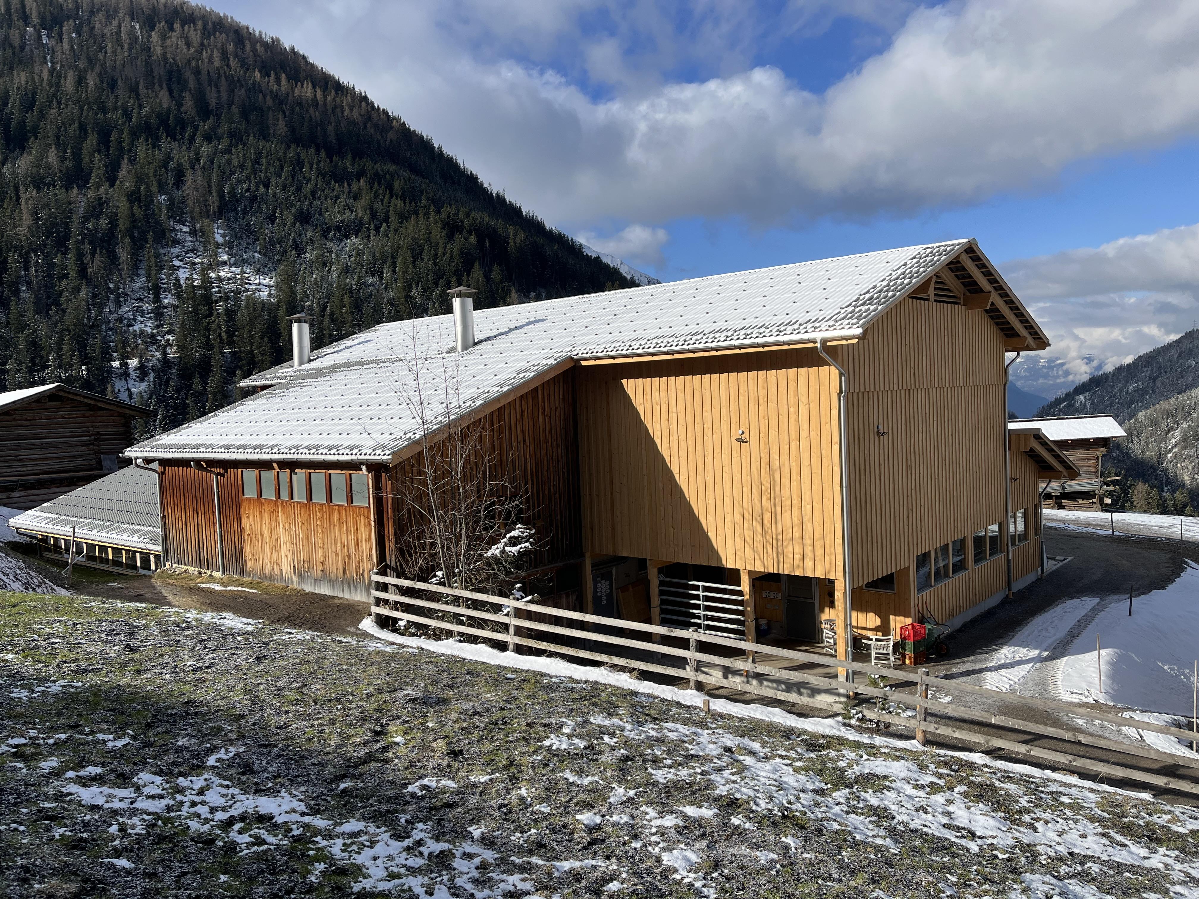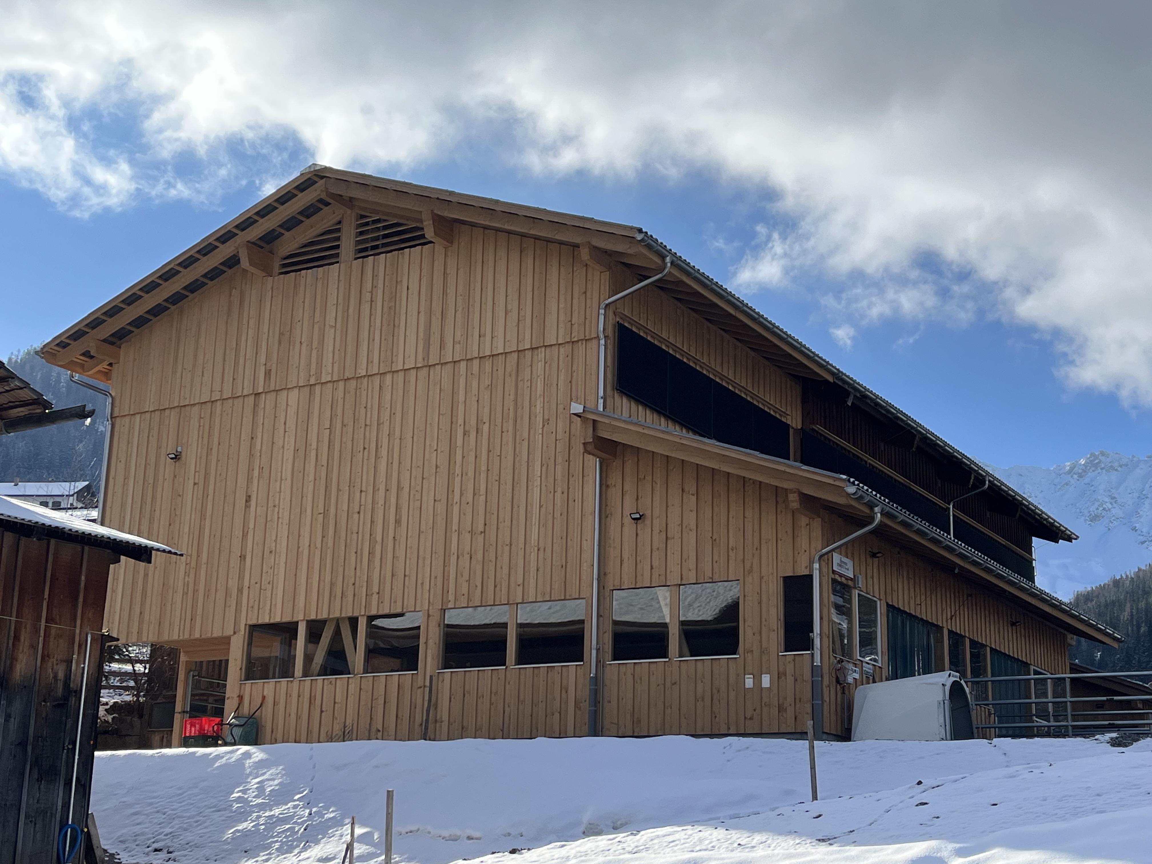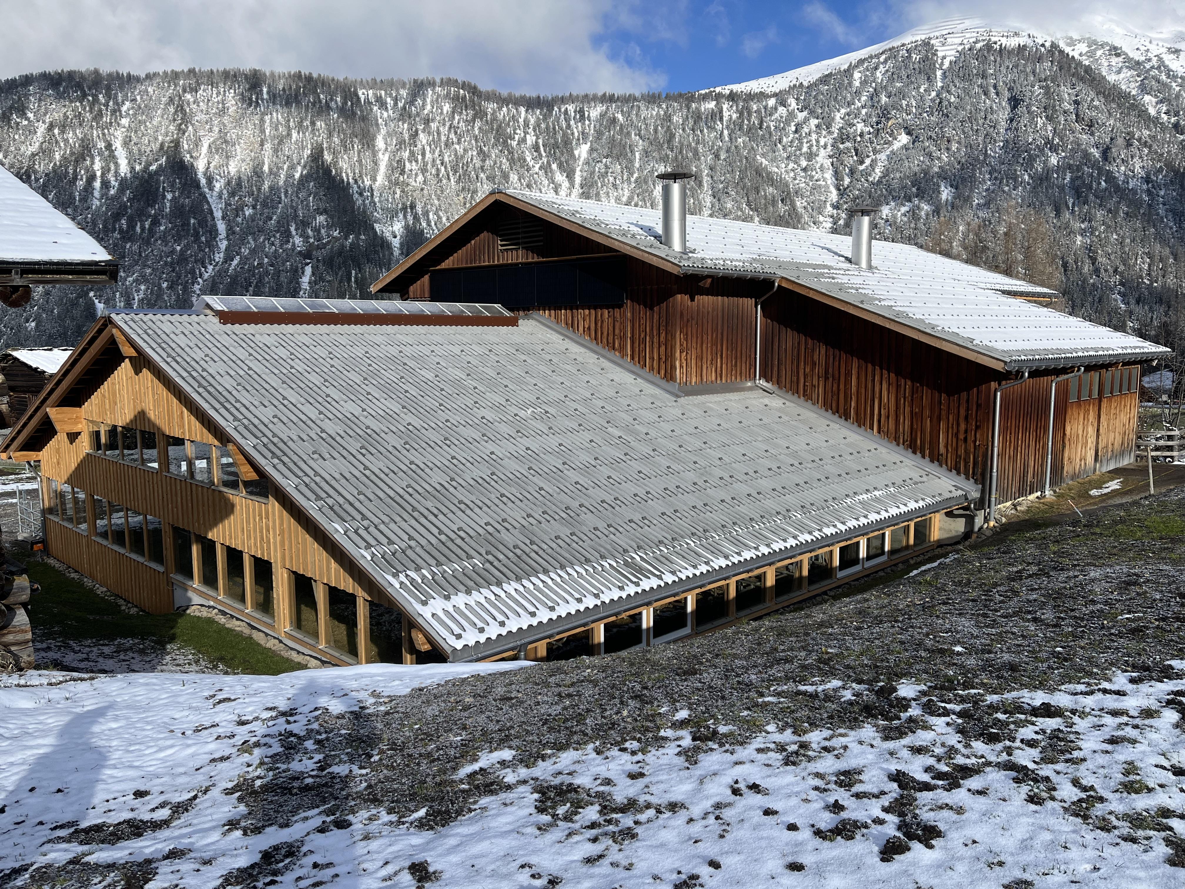 Der bestehende Stall ist als Holzbau in Sparren- Pfettenkonstruktion mit einer Fassadenschalung gebaut. Der Anbau wird als Holzbau mit Sparrenkonstruktion und Fassadenschalung realisiert. Die Jauchegrube und die Mistplatte wurden standardgemäss in Stahlbeton ausgeführt. Das Dach des bestehenden Stalls musste neu eingedeckt werden, da es undicht war, und wurde wie das neue Dach mit Welleternit eingedeckt.